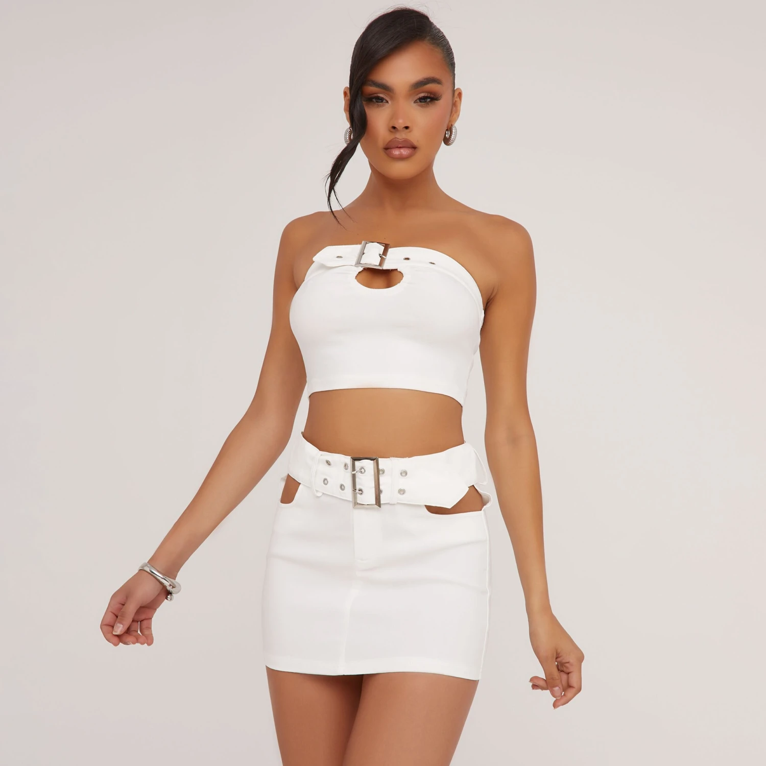 Earn some serious style points this season with this skirt doll. Featuring a cream material, a buckle front, cut out detailing and a mini length.