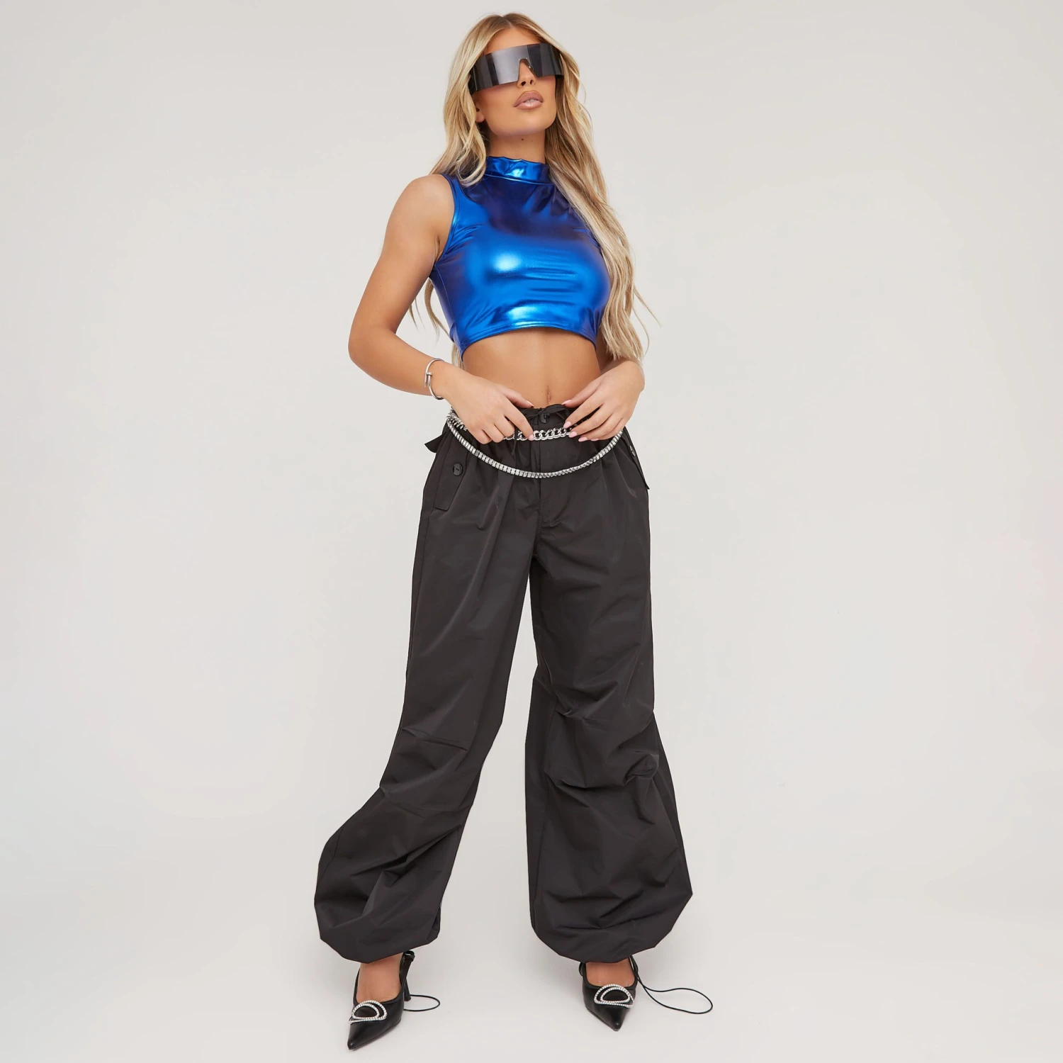 Festival season is fast approaching and we’ve got your outfit covered. Featuring a blue metallic material, with a high neck, a sleeveless design and a cropped length. Style with some cargo trousers for a statement look.