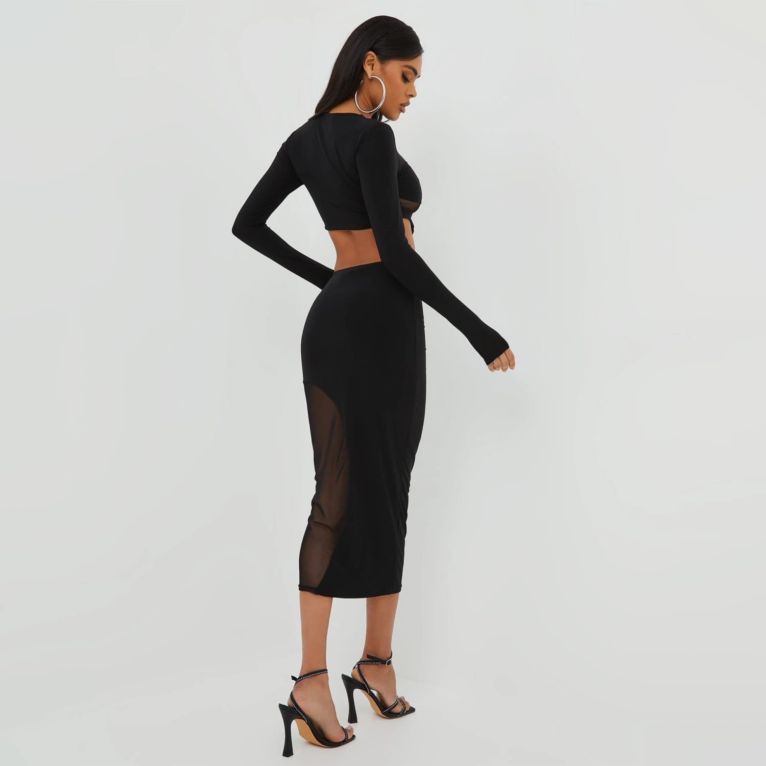 Make heads turn with this skirt doll. Featuring a black slinky material, mesh swirl detailing and a maxi length. Team this with the matching top and heels to complete the look.