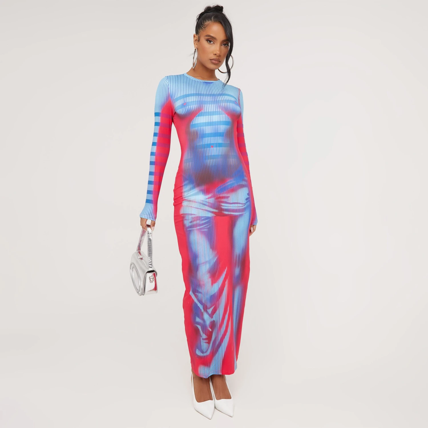 This dress is a yes from us girl. Featuring a pink multi material, body print detailing, long sleeves and a maxi length. Team this with some heels and a mini bag for a combo to die for.