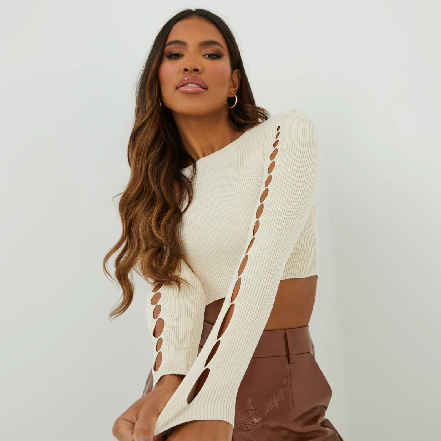 This top is perfect for A/W doll. Featuring a beige ribbed material, long cut-out sleeves and a cropped length. Team this with some shorts and a pair of heels for a look that’s perfect for brunchin’ with the girls.