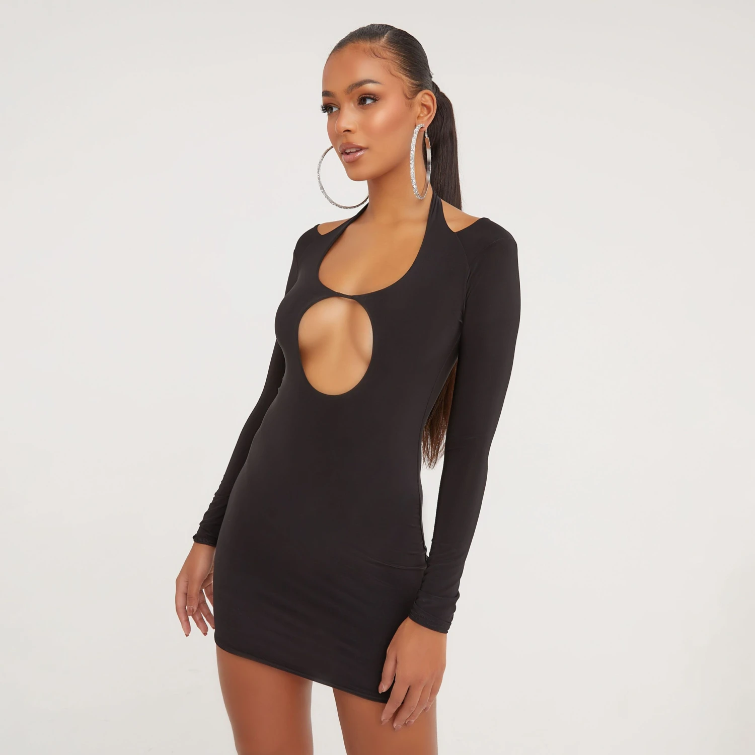 EGO Long Sleeve Halterneck Plunge Front Cut Out Detail Mini Bodycon Dress In Black Slinky