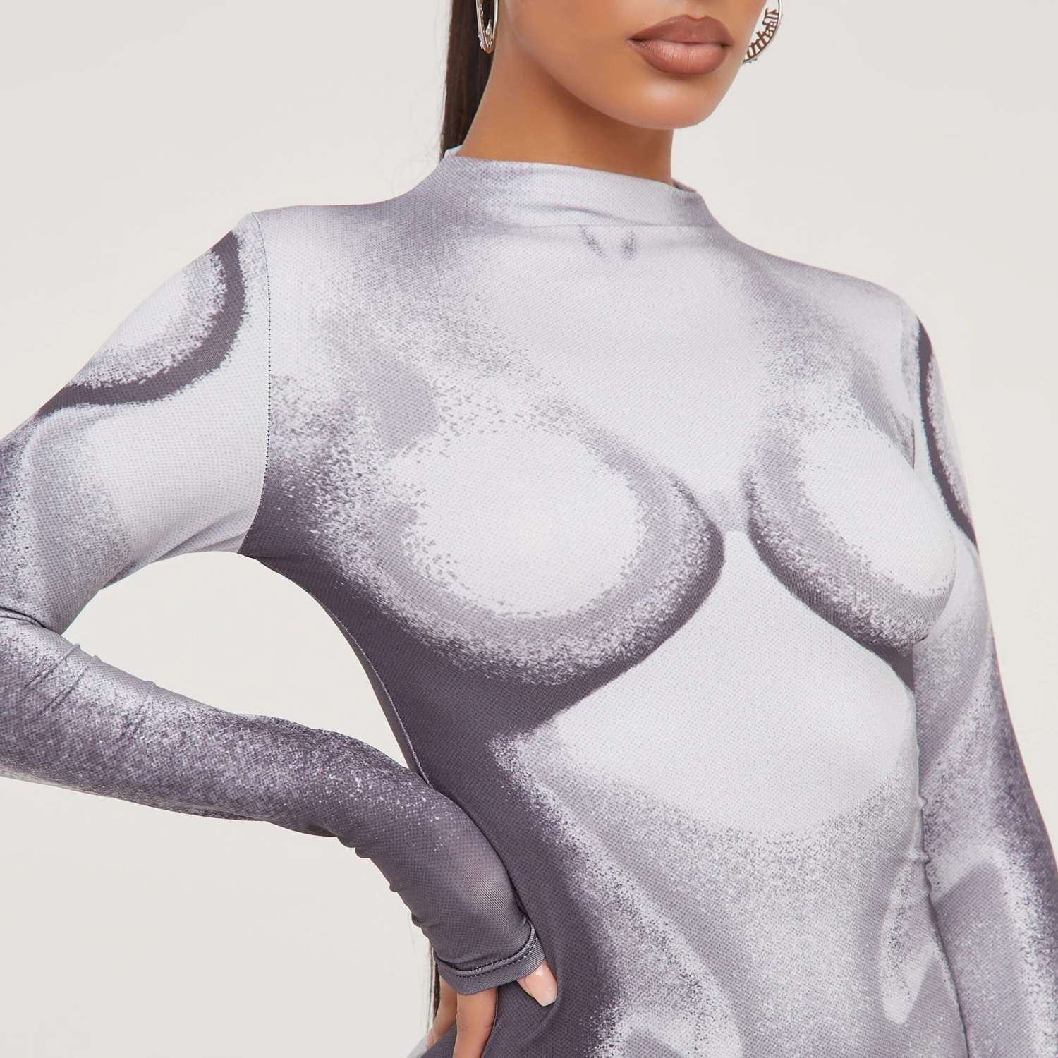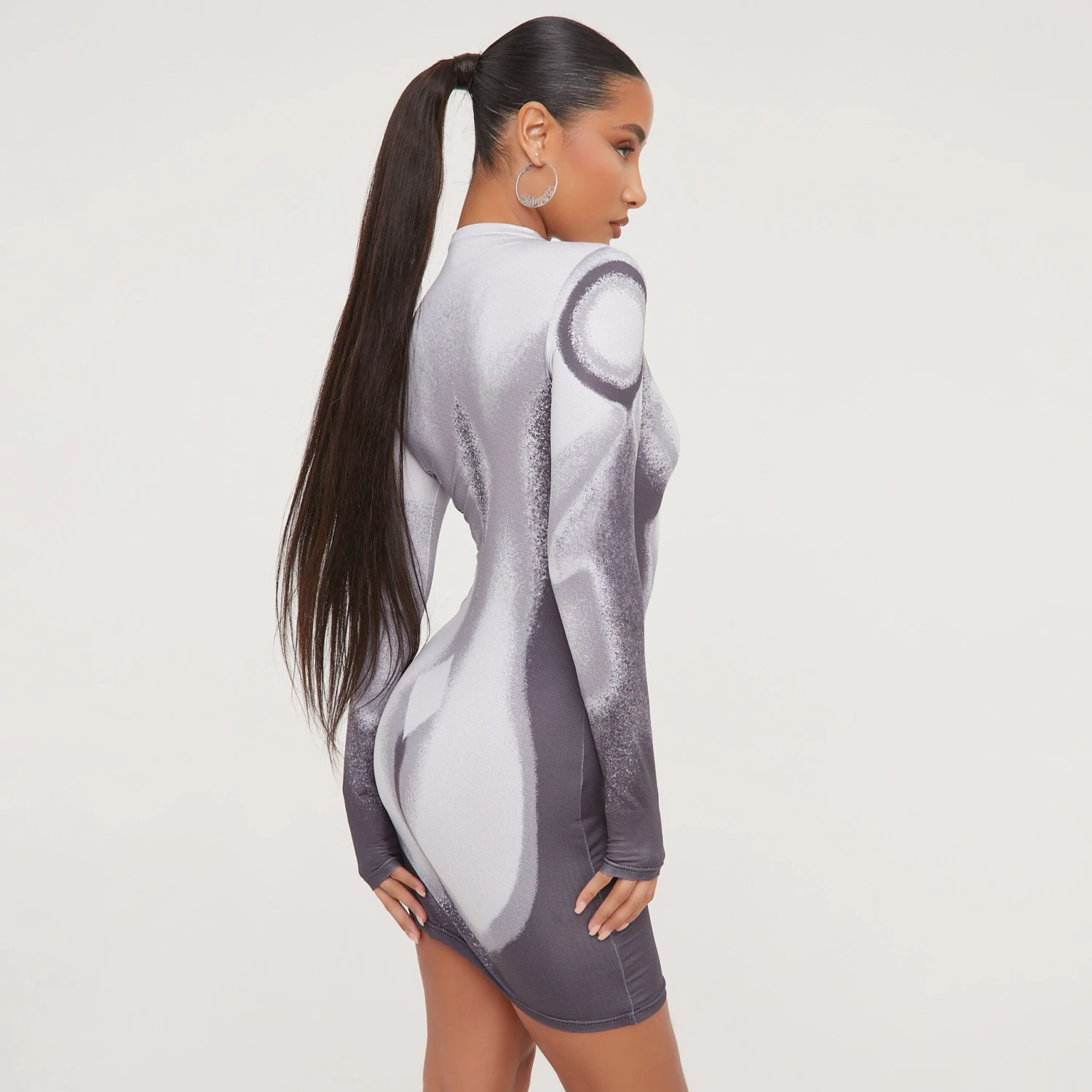 EGO Long Sleeve High Neck Body Print Detail Mini Bodycon Dress In Black And Grey