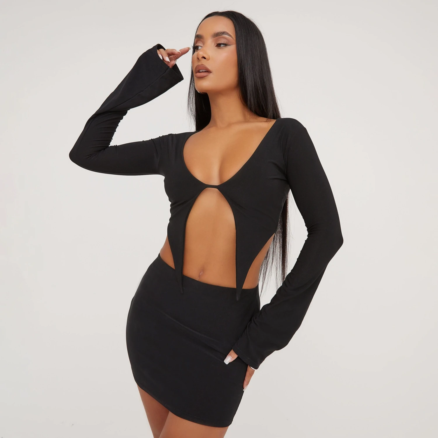 This top is an essential in your new season wardrobe doll. Featuring a black slinky material, a pointed hem detail and long sleeves. Team this with the matching skirt and heels to complete the look.