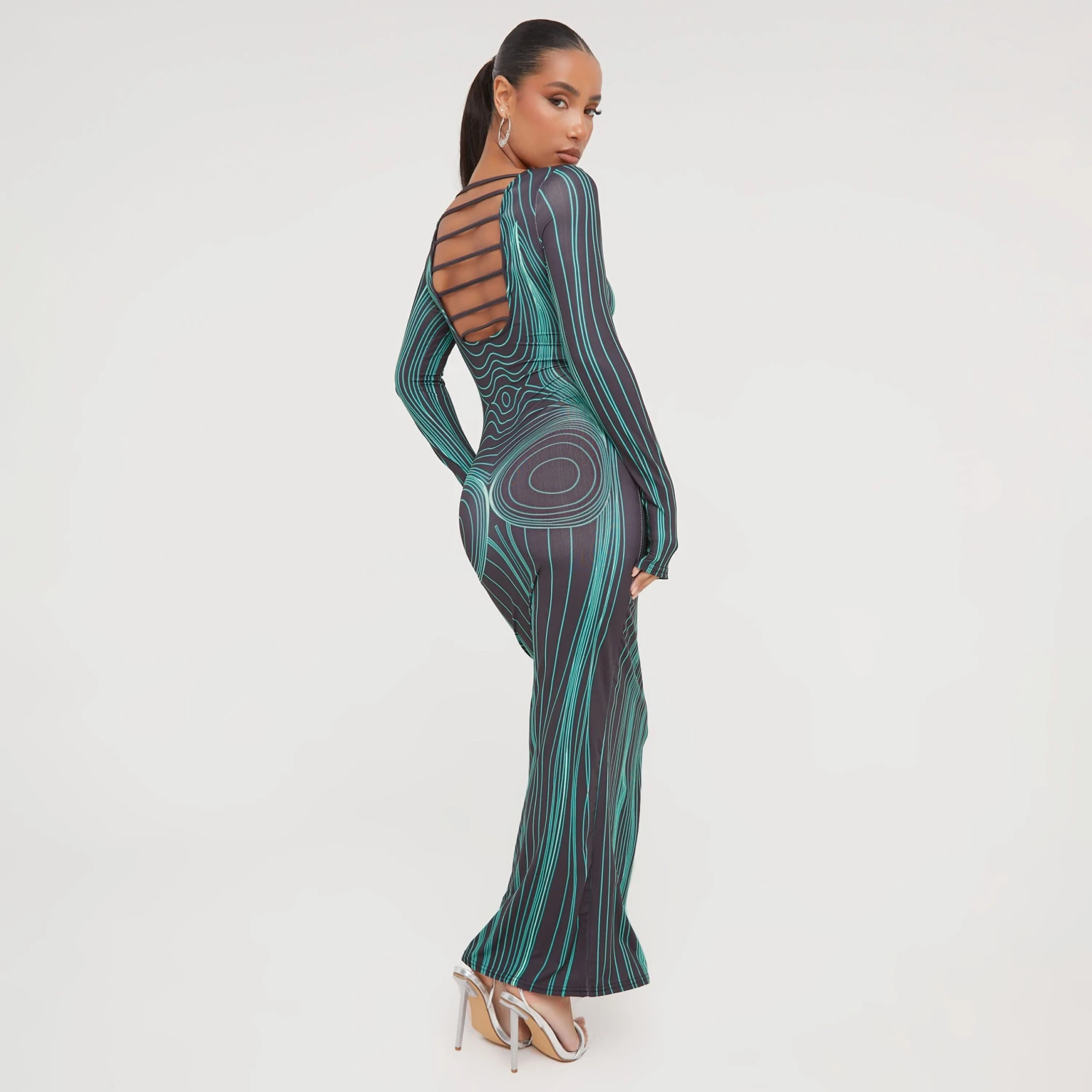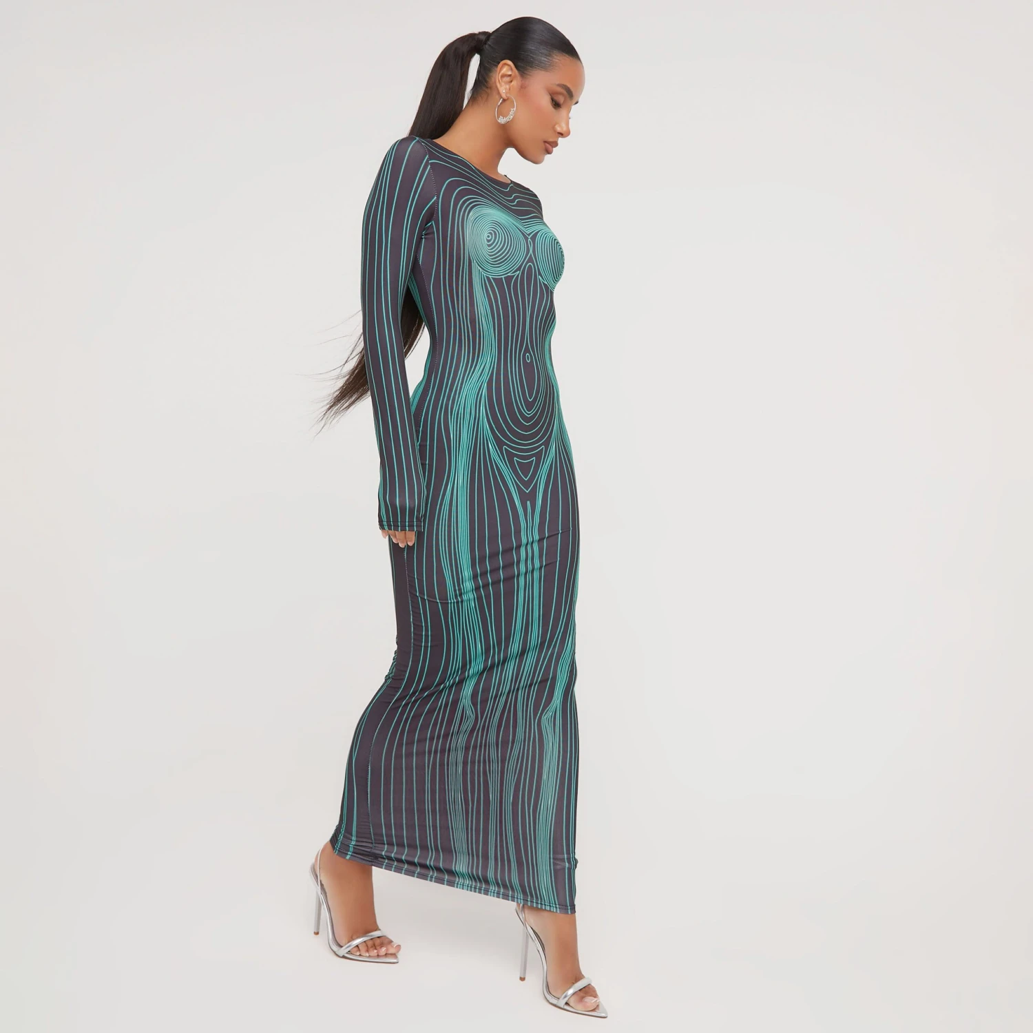 EGO Long Sleeve Strap Back Detail Body Print Maxi Bodycon Dress In Black And Green Slinky