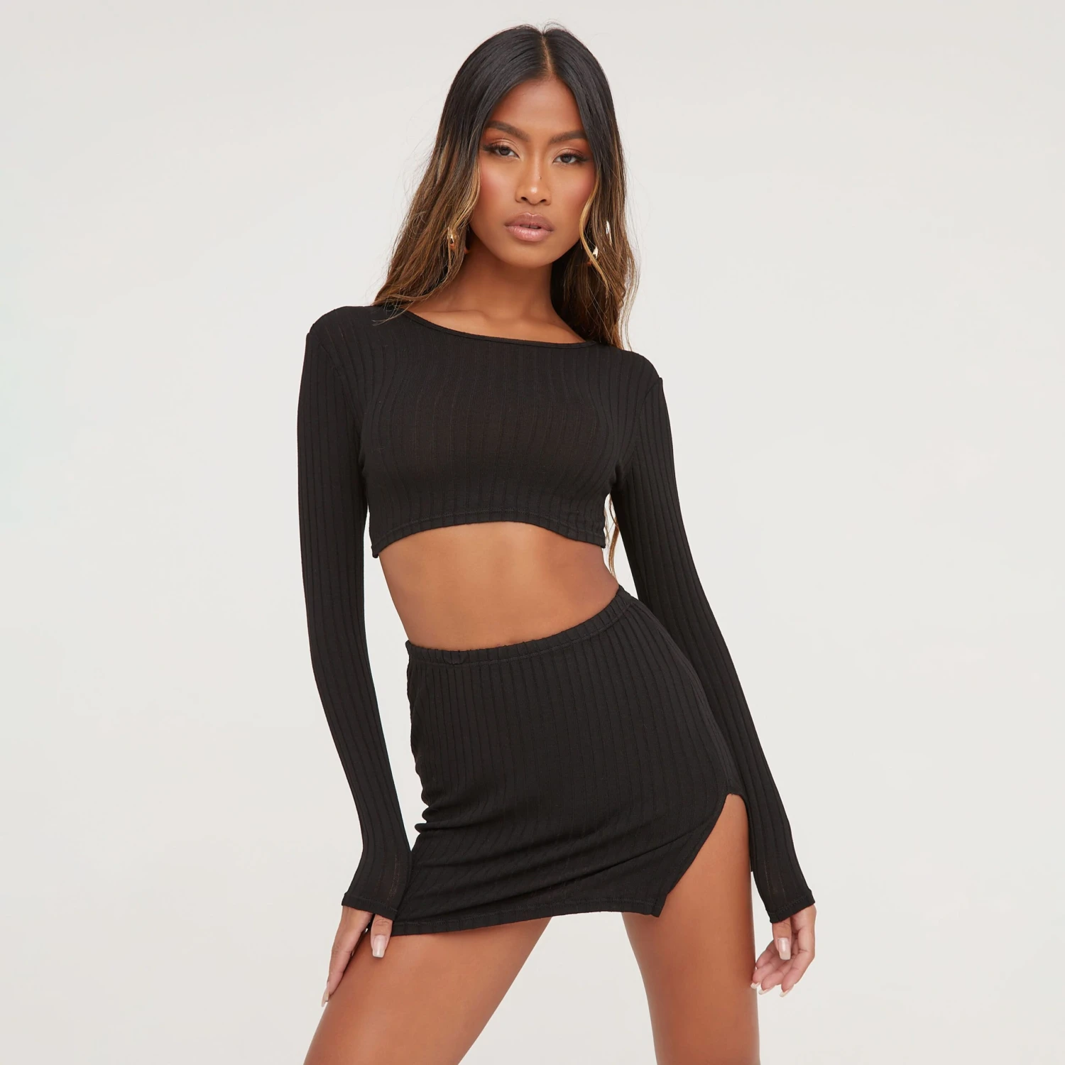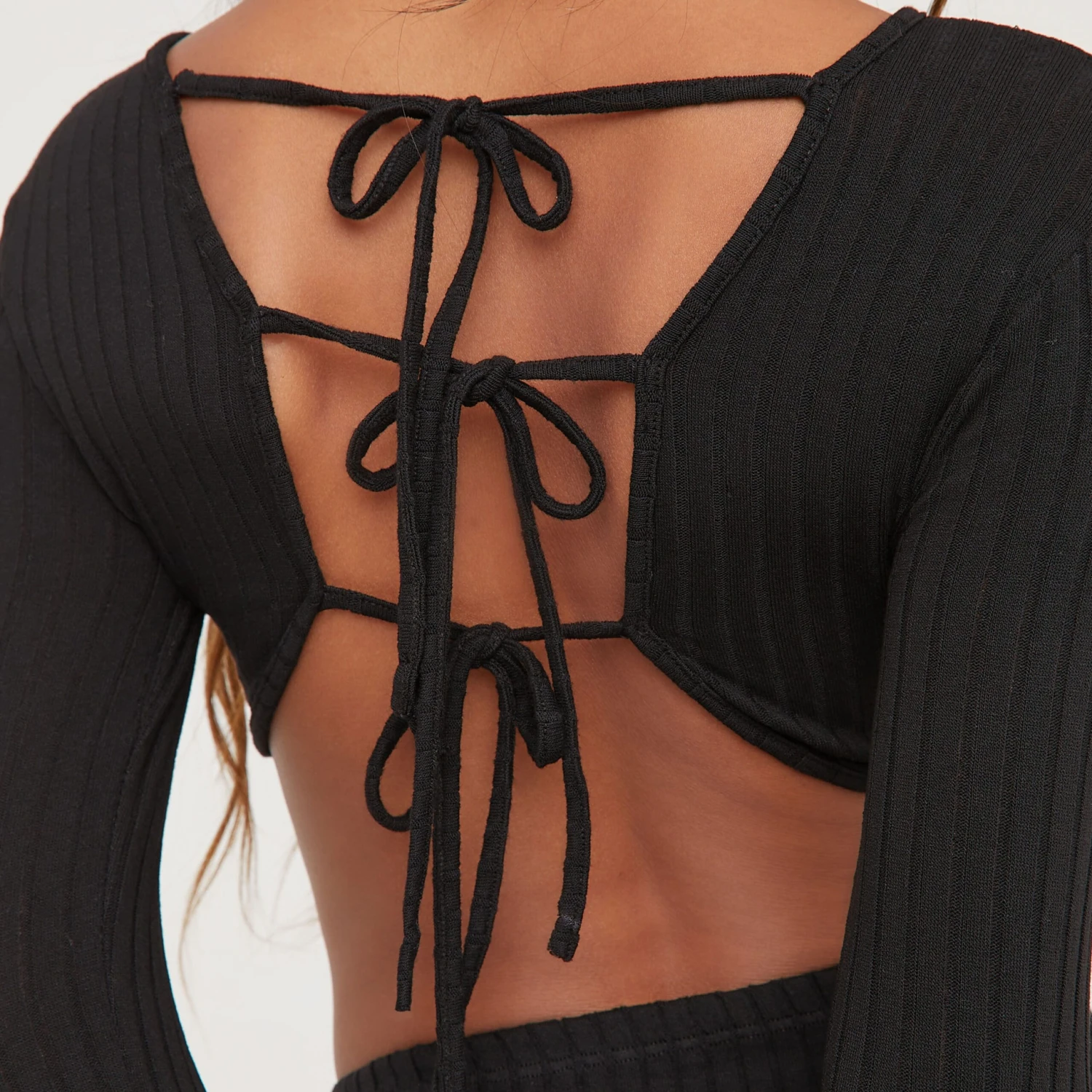 Who said you have to break the bank for your going out attire? Featuring a black ribbed material, tie back detailing, long sleeves and a cropped length. Team this with the matching skirt and heels for an effortless look we love.