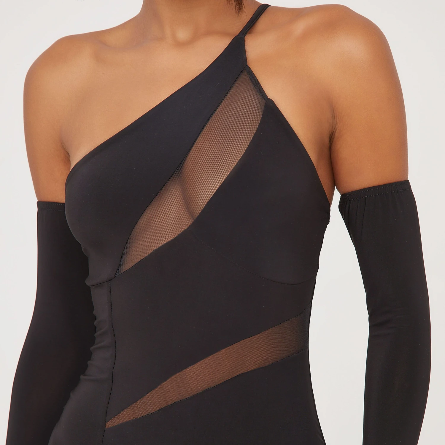 EGO One Shoulder Cut Out Mesh Panel Detail Mini Bodycon Dress With Sleeves In Black Slinky