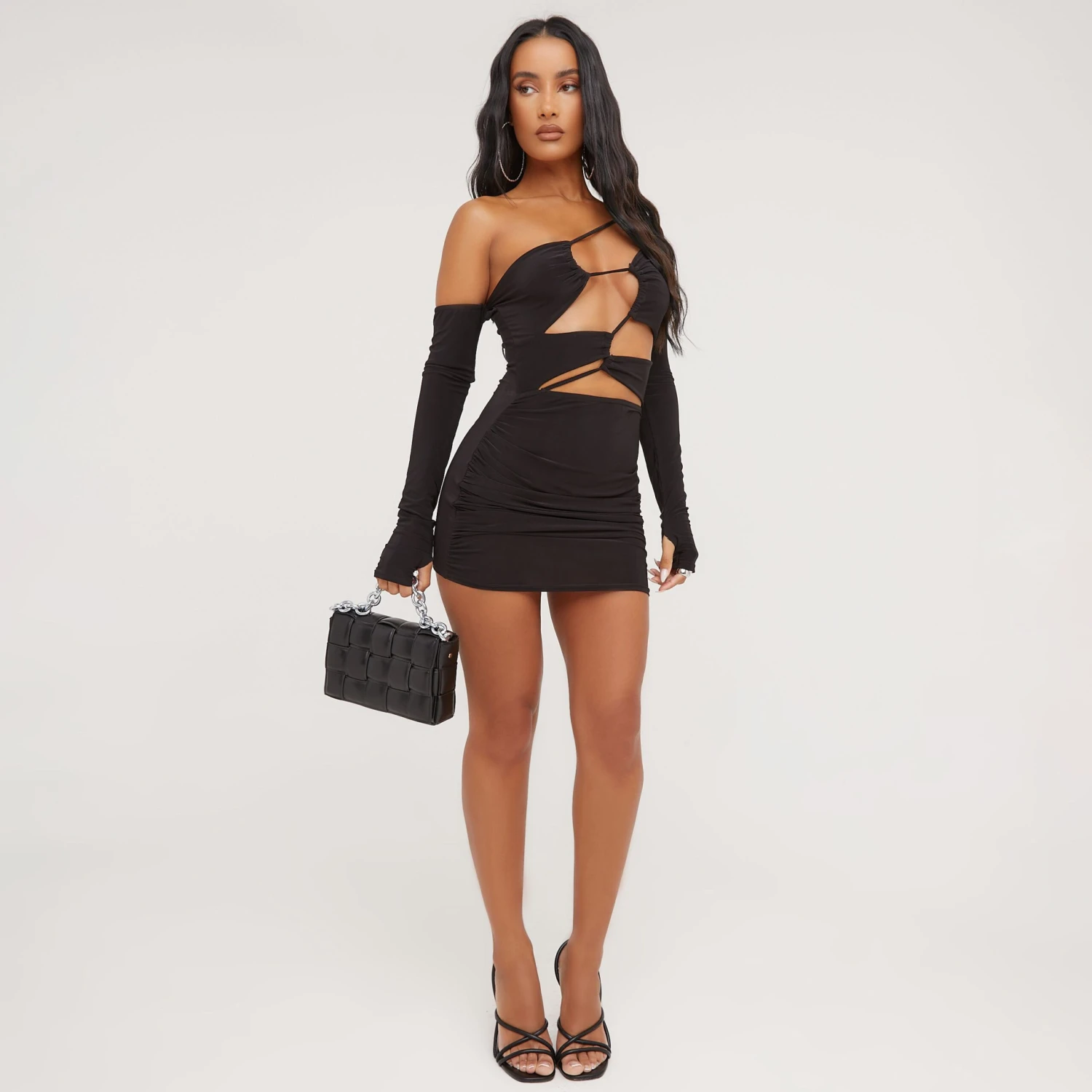 Be the first to review “EGO One Shoulder Strappy Cut Out Detail Mini Bodycon Dress With Sleeve In Black Slinky” Cancel reply