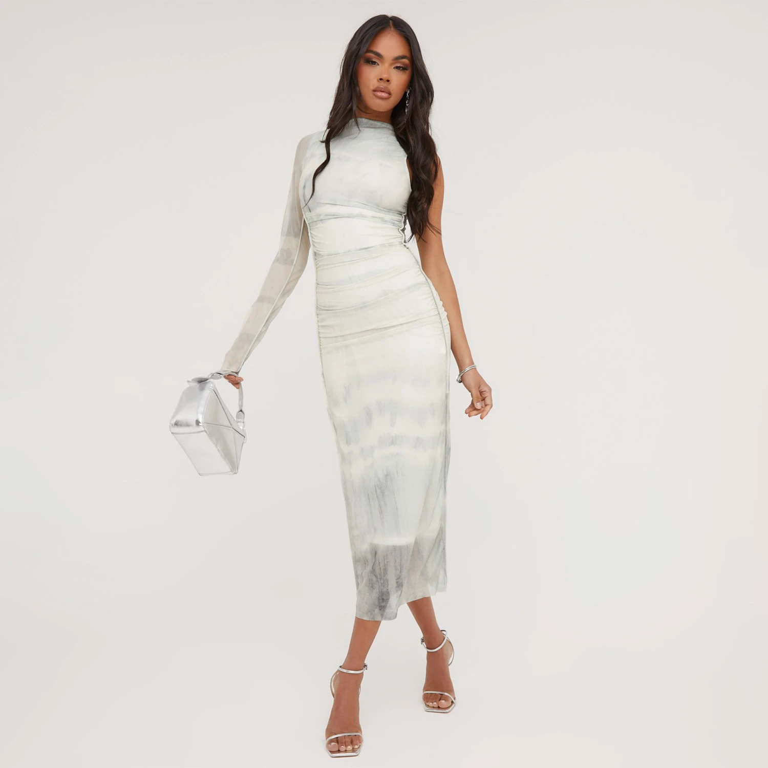 EGO One Sleeve High Neck Printed Maxi Dress In Ivory Mesh