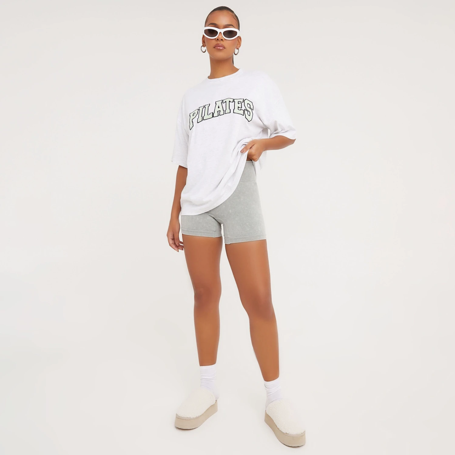 Saturday Pilates class with the dolls? This t-shirt is a must have doll. Featuring a grey material, a ‘Pilates’ slogan and an oversized fit. Team this with some cycling shorts and sliders for a look we’re obsessing over.