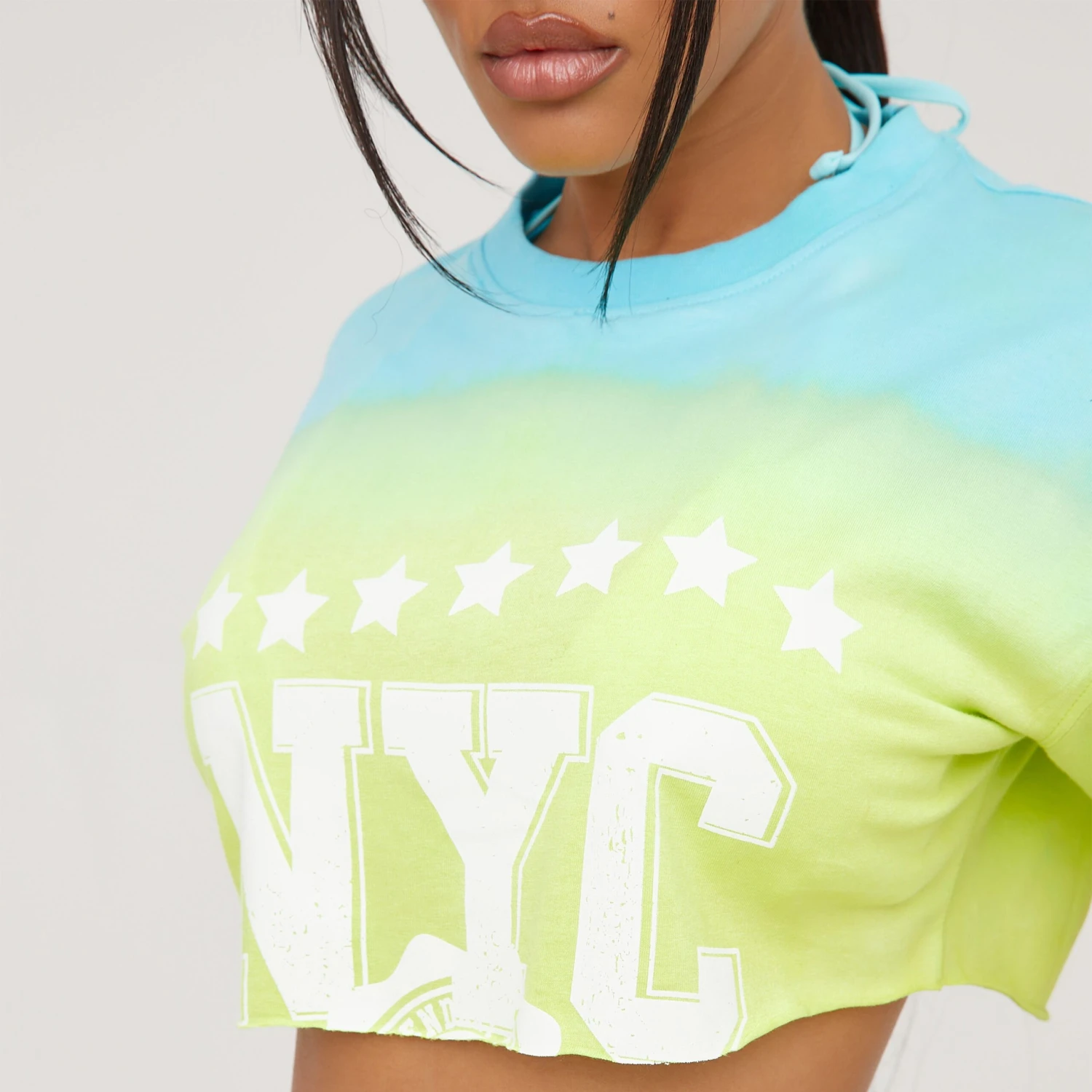 Add a bright hue to your summer wardrobe with this top doll. Featuring a blue and lime acid wash material, a NYC graphic print and a cropped length.