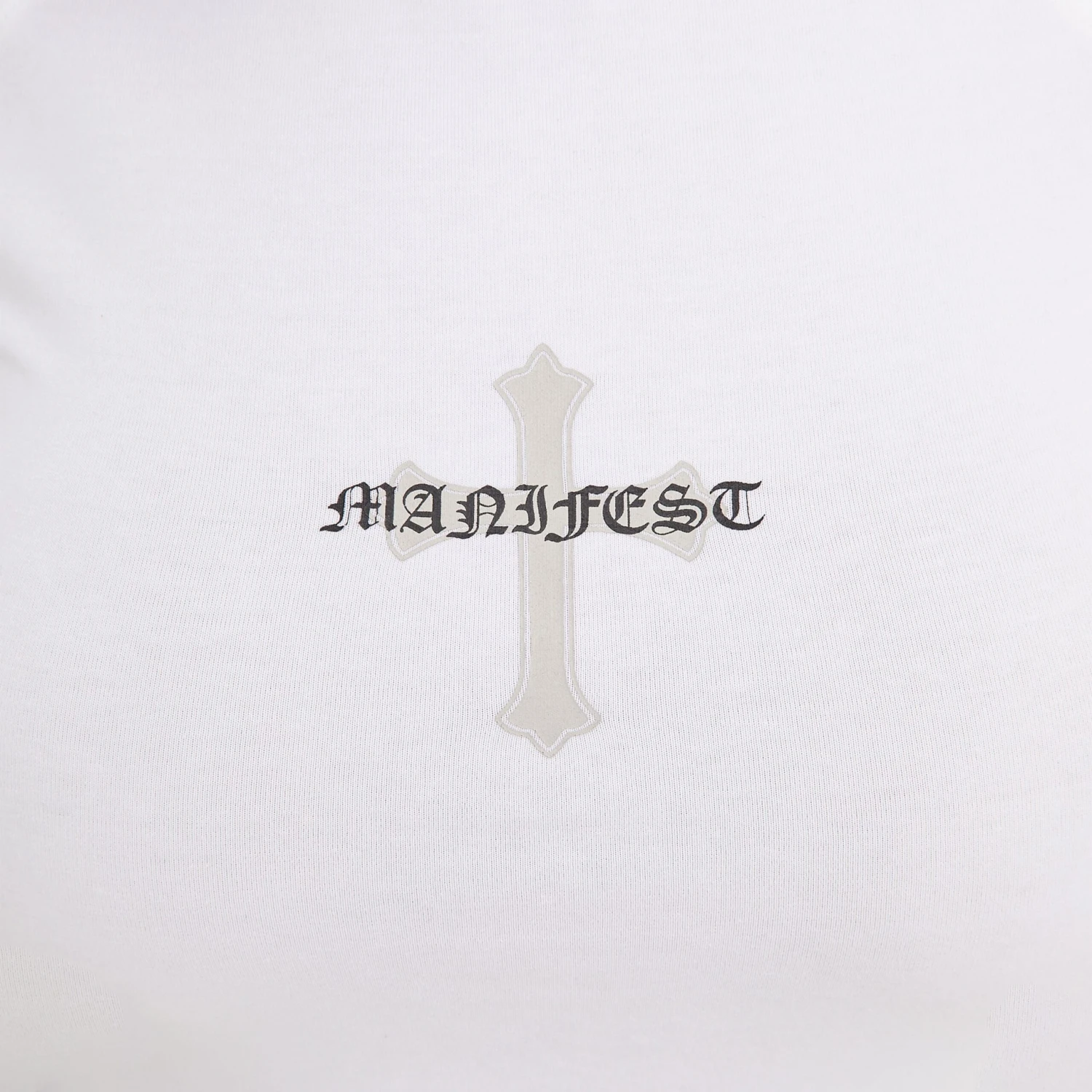 EGO Short Sleeve Ruched Front Detail Crucifix Print T-Shirt Dress In White