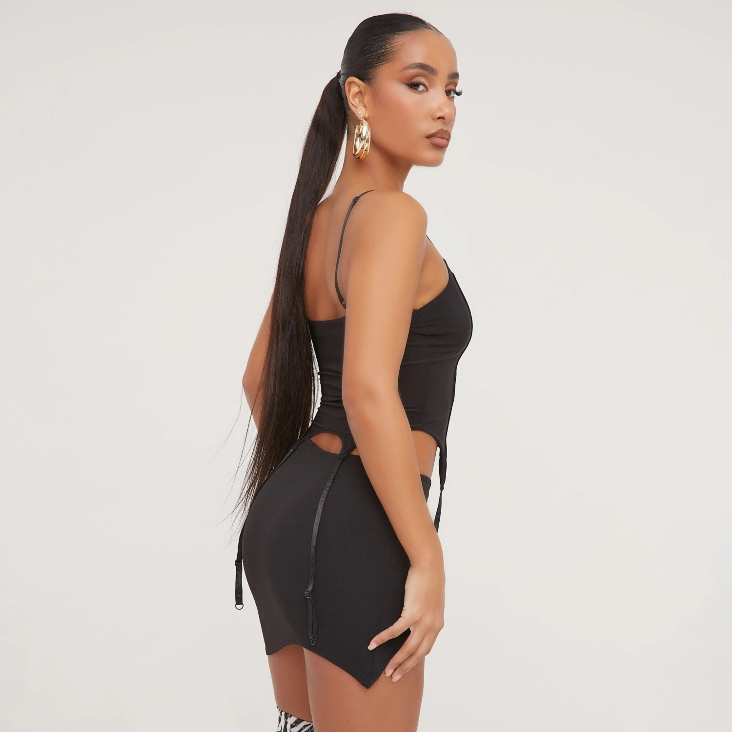 Look no further for your next going out attire with this top doll. Featuring a black slinky material, suspender strap detailing and a cropped length. Team this with a black mini skirt and heels for a killer look we love.